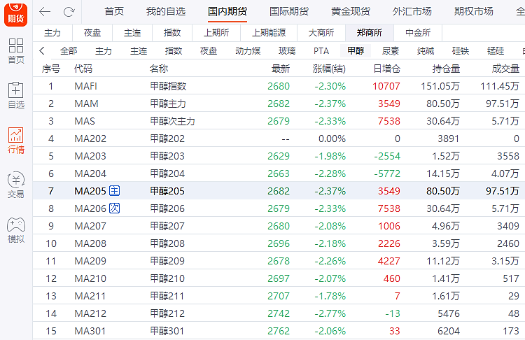 (郑商所甲醇各合约收盘情况;来源:东方财富期货PC端)