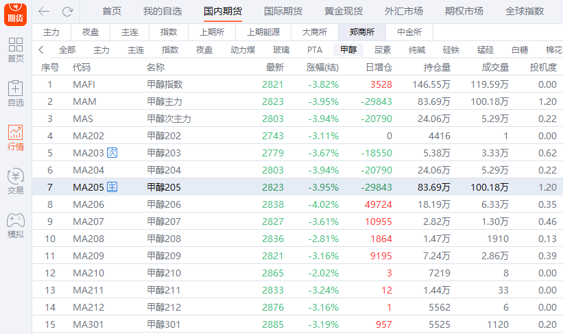(郑商所甲醇各合约收盘情况;来源:东方财富期货PC端)