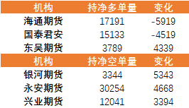 今日净多单变动排名前三的席位分别有海通期货(-5919)、国泰君安(-4519)和东吴期货(+4339);今日净空单变动排名前三的席位分别有银河期货(+5343)、永安期货(+4668)和兴业期货(+3394)。