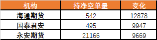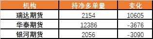 今日净多单变动排名前三的席位分别有瑞达期货(+10605)、华泰期货(-3676)和银河期货(-3090);今日净空单变动排名前三的席位分别有海通期货(+12878)、国泰君安(+9947)和永安期货(+9669)。