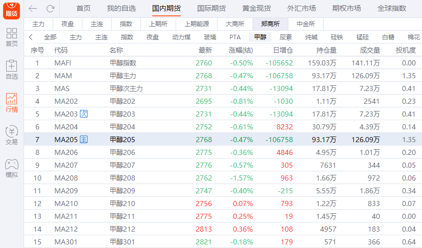 (郑商所甲醇各合约收盘情况;来源:东方财富期货PC端)