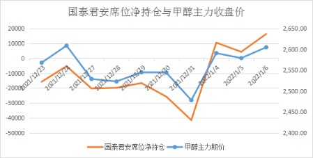 综上可知,前20席位整体处于持有净空单超5万手的状态,其中国泰君安期货今日净多单再次上破1万手;且由其净持仓与甲醇主力合约收盘价走势可知,在12月23日至1月6日期间,国泰君安的净持仓变化和行情具有较强正相关性,后续可关注其持仓变动情况。