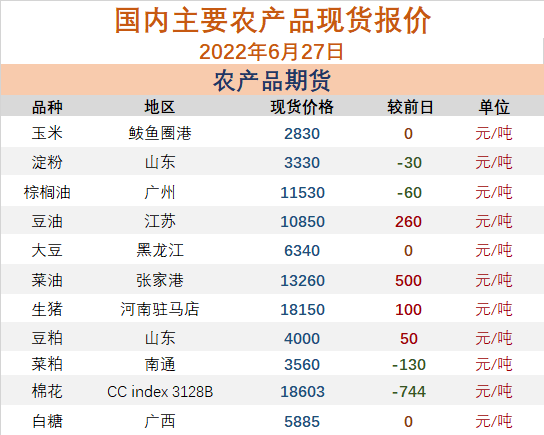6月27日国内农产品主流地区现货报价