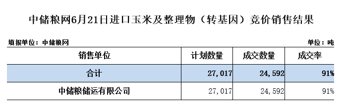 中储粮网6月21日进口玉米及整理物(转基因)竞价销售结果:计划数量27017吨,成交数量24592吨,成交率91%。