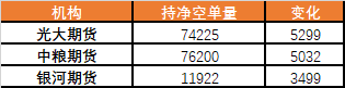 今日净多单变动排名前三的席位分别有东证期货(+4912)、一德期货(+4614)和华泰期货(+3792);今日净空单变动排名前三的席位分别有光大期货(+5299)、中粮期货(+5039)和银河期货(+3499)。