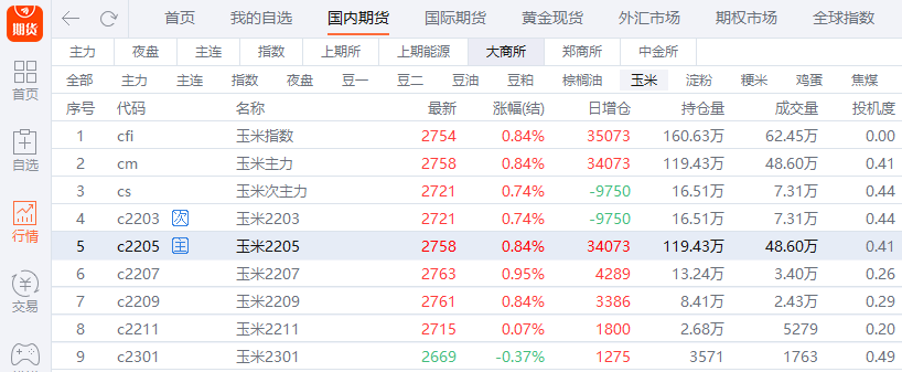 (大商所玉米各合约收盘情况;来源:东方财富期货PC端)