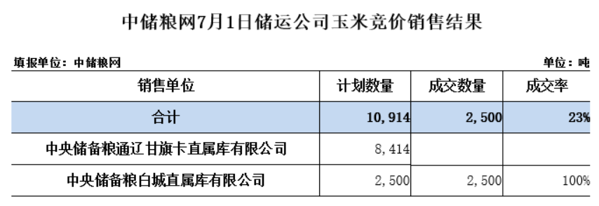 据中储粮网,7月1日储运公司玉米竞价销售结果,实际成交2500吨,成交率23%。
