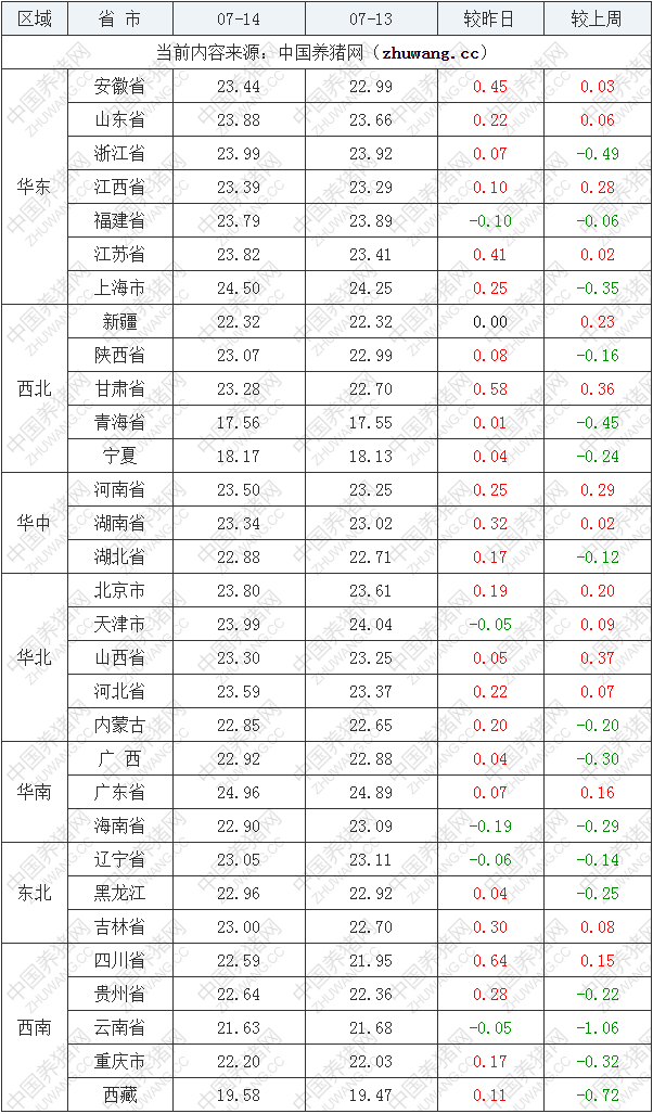 2022年7月14日全国外三元生猪现货价格整体小幅涨: