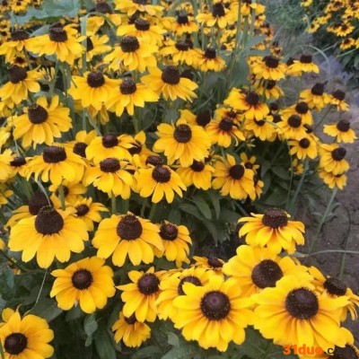 r形态特征 r r r 黑心菊菊科金光菊属,一二年生,株高60-100cm,头状花序8-9cm,重瓣花,舌状花黄色,有时有棕色黄带,管状花暗棕色。茎较粗壮,被软毛,稍分枝,具翼。互生叶粗糙,长椭圆形至狭披针形,长10~15cm,叶基下延至茎呈翼状,羽状分裂,5-7裂,茎生叶3-5裂,边缘具稀锯齿。 r r r 头状花序,径约2.5~5cm,伞房状着生,具短梗;舌状花中性,长1.5~2cm,黄色、褐紫色或具两色条纹;管状花褐色至紫色,密集成圆球形;春秋播,花期6~10月。夏季至秋季,耐寒耐旱,管理粗放,丛植片植,公路绿化,花坛花境,草地边植。也可作切花,露地越冬,能自播繁殖。全株被毛,近根出叶,上部叶互生,叶匙形及阔披针形,叶缘具粗齿。头状花序。[ r r