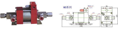 MD系列气液增压泵 MD系列泵为单驱动头双作用泵,其特性同M系列泵相同,但与同规格M系列泵相比,脉冲小且流量比M系列单作用泵提高50%。