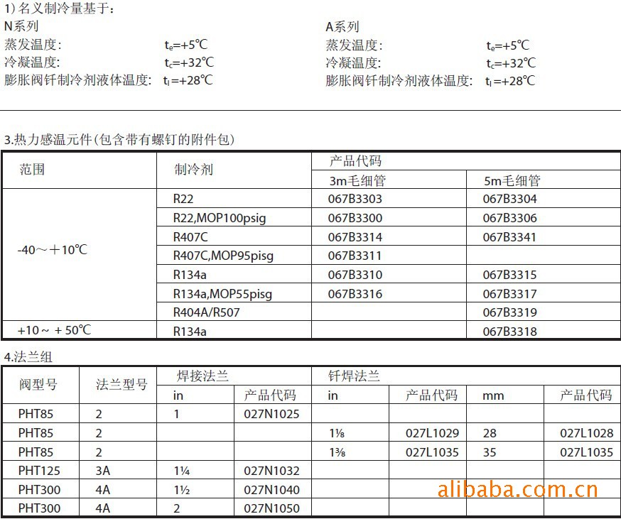 用于各种型号的阀体和蒸发温度。感温元件的冲注物量基于蒸发温度范围。主阀(除PHT300)的特氟纶