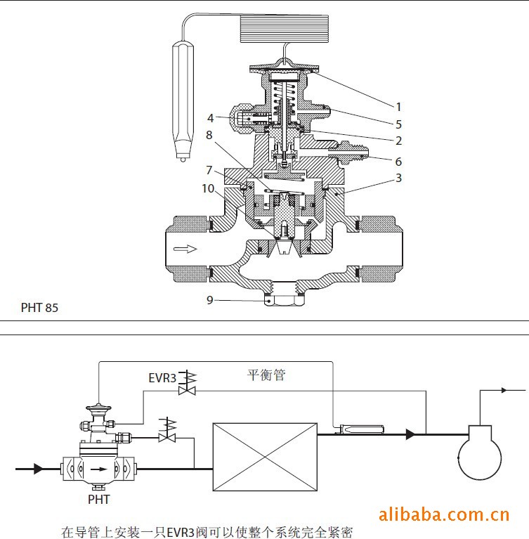 阀片10保证主阀的紧密型。所有的PHT都是外平衡阀。该阀亦能承受热气除霜的影响。