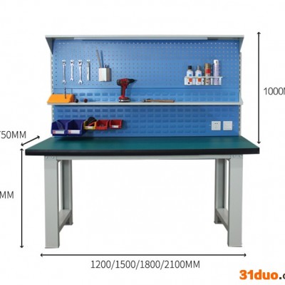 工作台配置的抽屉、柜门方便使用者存储工具。 工作台桌面上可以增加不同的组件,如百页、方孔挂板,电源插座、照明灯具、吊具等。配合零件盒及各种不同的挂钩,工作台还可以存放各种常用的零件、工具等,更加合理地使用空模具工作台,榉木工作台,防静电工作台,中型工作台,重型工作台,包面台面,高分子台面,防火板台面加装台钳,工具柜,工艺看板,放置板,日光灯,气管,脚轮等常常用规格:1200*750*800,1500*750*800,1800*750*800,2100*750*800