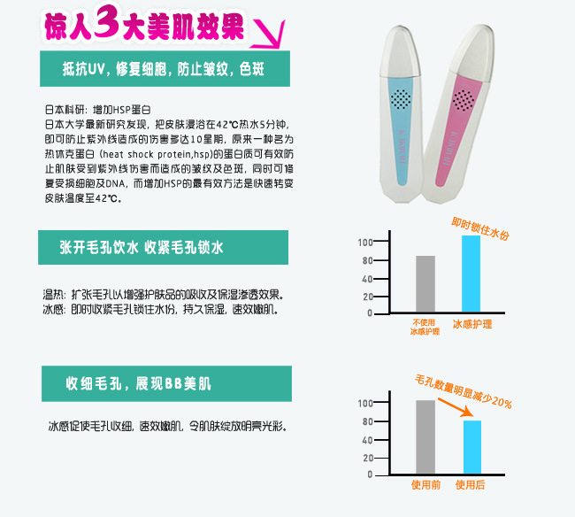 日本大学教授研究显示,反复令皮肤达到42℃的温度,有助于制造HSP蛋白,修复肌肤细胞及加强皮肤弹性,从而防止皱纹的形成。而这种冰热美肌棒,热的42℃护理可以帮助扩张毛孔,方便深层清洁。而12℃冷冻护理则可瞬间收细肌肤毛孔,锁紧护肤品的水分于深层皮肤之中,让你交替进行温热和冷冻护理。