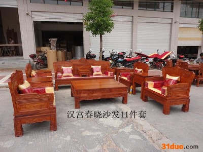 产品详细 【名称】汉宫春晓沙发11件套 【结构】精雕 榫卯精巧手工工艺 【材质】缅甸花梨木(大果紫檀) 非洲黄花梨**紫檀) 【颜色】原木色/金黄色/金黄色偏红/老红木色等,也可按照客户要求上色。 【产地】浙江省东阳市——中国木雕城 【包装】汽泡+纸板 【周期】现货1-2天发货 【运费】到付 【编号】ZR-006 【规格】 三人位沙发:218*65*40*110(靠背) 单人位沙发:91*65**40*110(靠背) 大平几:145*106*50; 小茶几:60*50*60 高花几:55*55*73高 小炕几:53*38*24 联系方式:张丽娟 微信/电话18357953252 QQ2920170001 明清红木家具 彰显主人文化底蕴