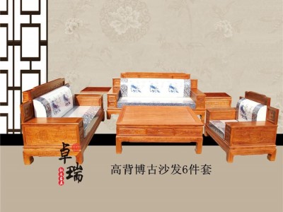 产品详细 【型号】ZR-014 【名称】:高背博古沙发6件套(1+2+3组合) 【结构】精雕 榫卯精巧手工工艺 【材质】缅甸花梨木(大果紫檀) 非洲黄花梨**紫檀) 【颜色】原木色/金黄色/金黄色偏红/老红木色等,也可按照客户要求上色。 【产地】浙江省东阳市——中国木雕城 【包装】汽泡+纸板 【周期】现货1-2天发货 【运费】到付 【规格】 三人位沙发:236*82*45/*108靠背 双人沙发:178*82*45/*108靠背; 单人沙发:125*82*45*108靠背; 大平几:138*98*51 小茶几:59*59*63 浙江东阳卓瑞红木是一家专业生产仿古门窗、明清家具、东阳木雕等产品的厂家,产品精工细作,别具特色,适用于各大、中型会议室、宾馆、茶楼、酒店等室内装饰。