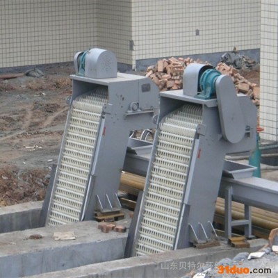 自清式格栅除污机主要由机架、驱动装置、齿耙及传动链条组成。由ABS工程塑料、尼龙6、尼龙1010或不锈钢制成特殊形状的耙齿按一定次序装配在齿耙轴上,形成一条封闭的耙齿链。水下栅片(耙齿)截留污物沿轨上行,当达到项部时,因弯轨和齿轮的导向作用,使相邻耙齿间产生相对推移运动,将污物外推,依自重卸入污物盛器内。同时特制转刷将耙齿上微量残留污物剔除干净。