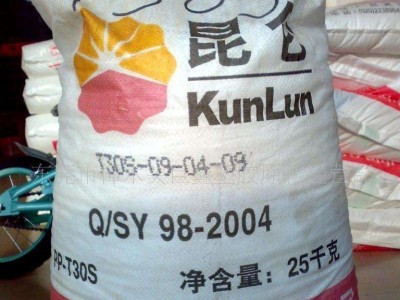 r供应PP兰州T30S:熔指2.0~4.0 g/10min适用于纺织撕裂膜、编织袋和地毯衬底熔体流动速率:3 g/10min拉伸强度:33 MPa维卡软化点:153 ℃热变形温度:86 ℃。 强度:33 MPa维卡软化点:153 ℃热变形温度:86 ℃适用于纺织薄膜纤维、地毯基布等