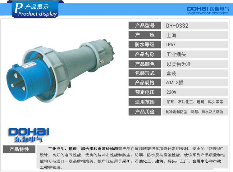 本网页所展示的有关【DOHAI 3极工业插头IP67 63A 220V 防水3插 3芯航空插 DH-0332_电工电气网_上海东海电气集团成套设备有限公司】的信息/图片/参数等由【生意多】-免费发布分类信息的会员【上海东海电气集团成套设备有限公司】提供,由【生意多】-免费发布分类信息会员【上海东海电气集团成套设备有限公司】自行对信息/图片/参数等的真实性、准确性和合法性负责,本平台(本网站)仅提供展示服务,请谨慎交易,因交易而产生的法律关系及法律纠纷由您自行协商解决,本平台(本网站)对此不承担任何责任。您在本网页可以浏览【DOHAI 3极工业插头IP67 63A 220V 防水3插 3芯航空插 DH-0332_电工电气网_上海东海电气集团成套设备有限公司】有关的信息/图片/价格等及提供【DOHAI 3极工业插头IP67 63A 220V 防水3插 3芯航空插 DH-0332_电工电气网_上海东海电气集团成套设备有限公司】的商家公司简介、联系方式等信息。