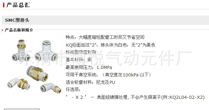 适用流体:水或空气 气动接头的技术要求: 1.软质气管外径应在±0.15毫米范围,硬质气管外径应在±0.1毫米以内; 2.气管插入端应用专用工具沿垂直面平整剪切,气管表面应光滑无变形,无异物以确保密封性; 3.螺纹连接处要用生料带增强密封性,特别是二次使用的螺纹部位。公制螺纹要有橡胶圈用于密封; 4.使用条件**高压力小于等于1.5MPa。2.流体温度在零下25至70度之间。3.使用环境未结冻及凝霜。4.使用软管材质为:尼龙、软尼龙、聚氨酯。