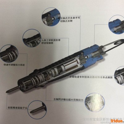 ●单进气双排气特殊材质叶片,造就大扭力输出范围,马达适用寿命长; ●交错轨道式离合器结构,单点跳脱扭力稳定,大扭大范围输出,满足不同锁付需求; ●五轴同步加工,合金钢齿轮,上下同心转动,达到低噪音、地震动、高精度的境界; ●人体工学外壳设计,软材质像胶手柄,外观新颖握感舒适,长期作业不易疲劳; ●正反转切换开关,更换起子头,快速调整扭力,操作简单。
