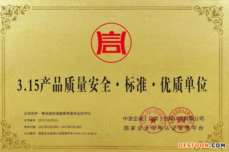 台评估,青田县林源蜜蜂养殖专业合作获得“3.15产品质量安全标准优质单位”证书及牌匾。“3.15产品质量安全标准优质单位证书”代表了产品质量安全标准评定的最高级别,此次在企业产品质量安全评选中获得3.15产品质量安全标准优质单位认证,是对青田县林源蜜蜂养殖专业合作实力和信誉的高度认可,是公司在健康发展过程中获得的又一重要里程碑,这一资质对企业后续发展具有深远的意义。