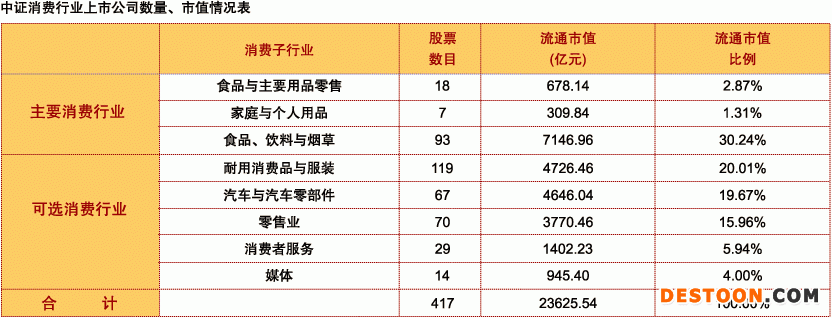 (4)包容消费行业多元投资机会易方达消费行业基金将周期性相对较弱的主要消费行业与周期性较强的可选消费行业一并纳入基金的投资范围,覆盖食品饮料与烟草、耐用消费品与服装等8个消费子行业,覆盖流通市值达2.4万亿(2010年3月31日数据),使得本基金在消费行业的投资机会更加广泛、多元,并且提供相对充足的市场容量与流动性。