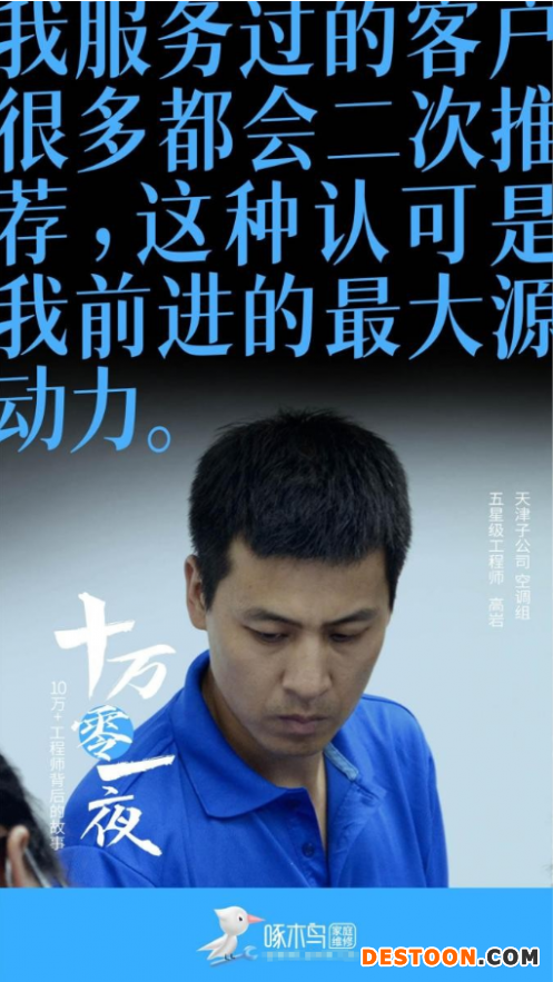 高岩,来自天津子公司,是空调组的星级工程师。做过服装&平面设计师,也自己创业做过新能源材料,搞过APP开发,这些行业中,从事最长时间是7年,但他始终觉得这些都不是自己喜欢的事情。于是就索性停下来仔细思考自己接下来应该去做什么?经过一段时间的思考,高岩师傅最终选择了家庭维修行业。从小对机修、维修感兴趣的他觉得自己很适合这个行业。人只有做自己喜欢做的事情才会开心,内心有激情,所以就这样义无反顾地选择了啄木鸟家庭维修。