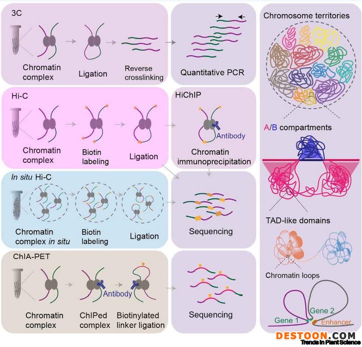 鉴于该课题组在植物三维基因组学领域的取得的系列研究进展,Trends in Plant Science杂志邀请课题组撰写Technology of the Month的综述文章。文章介绍了3C,Hi-C,in situ Hi-C,DLO Hi-C,ChIA-PET和HiChIP等应用于植物三维基因组学研究的技术,并阐述了应用这些技术解析的植物基因组的三维结构,特别关注了ChIA-PET和Hi-ChIP检测的染色质环(chromatin loop)结构。文章最后指出了目前植物三维基因组学研究技术的优势以及面临的挑战,对未来植物三维基因组学技术的开发以及三维基因组结构的解析具有启示意义。